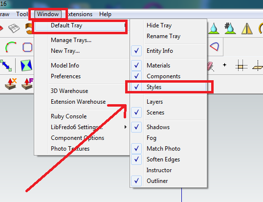 Untuk mengubah gambar background pada lembar kerja SketchUp pertama kalian aktifkan tab Style dengan cara pilih Window>Default tray>Style.